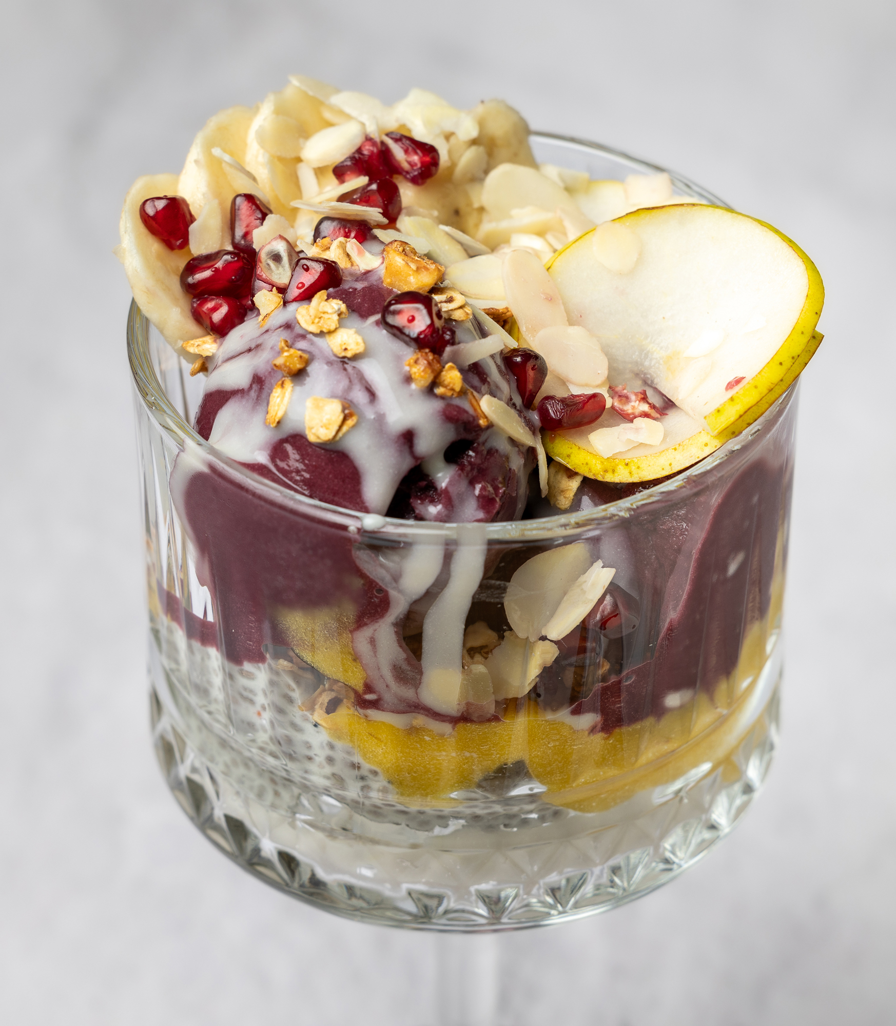 Açaí, vanilla chia, mango and passion fruit purée, white chocolate, seasonal fruit