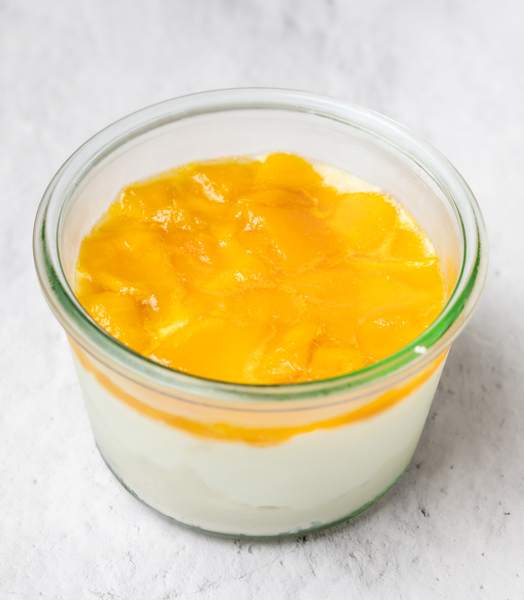 Mus od marakuje i manga, čia vanila, mango, badem list, kokos mus, sezonsko voće / Passion fruit and mango mousse, vanilla chia, mango, almond flakes, coconut mousse, seasonal fruit