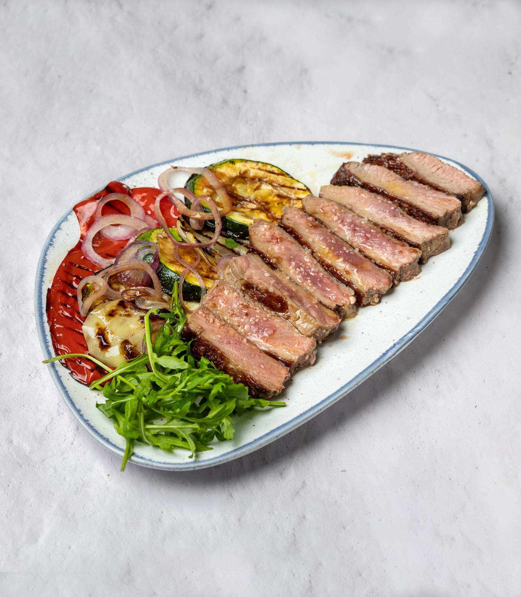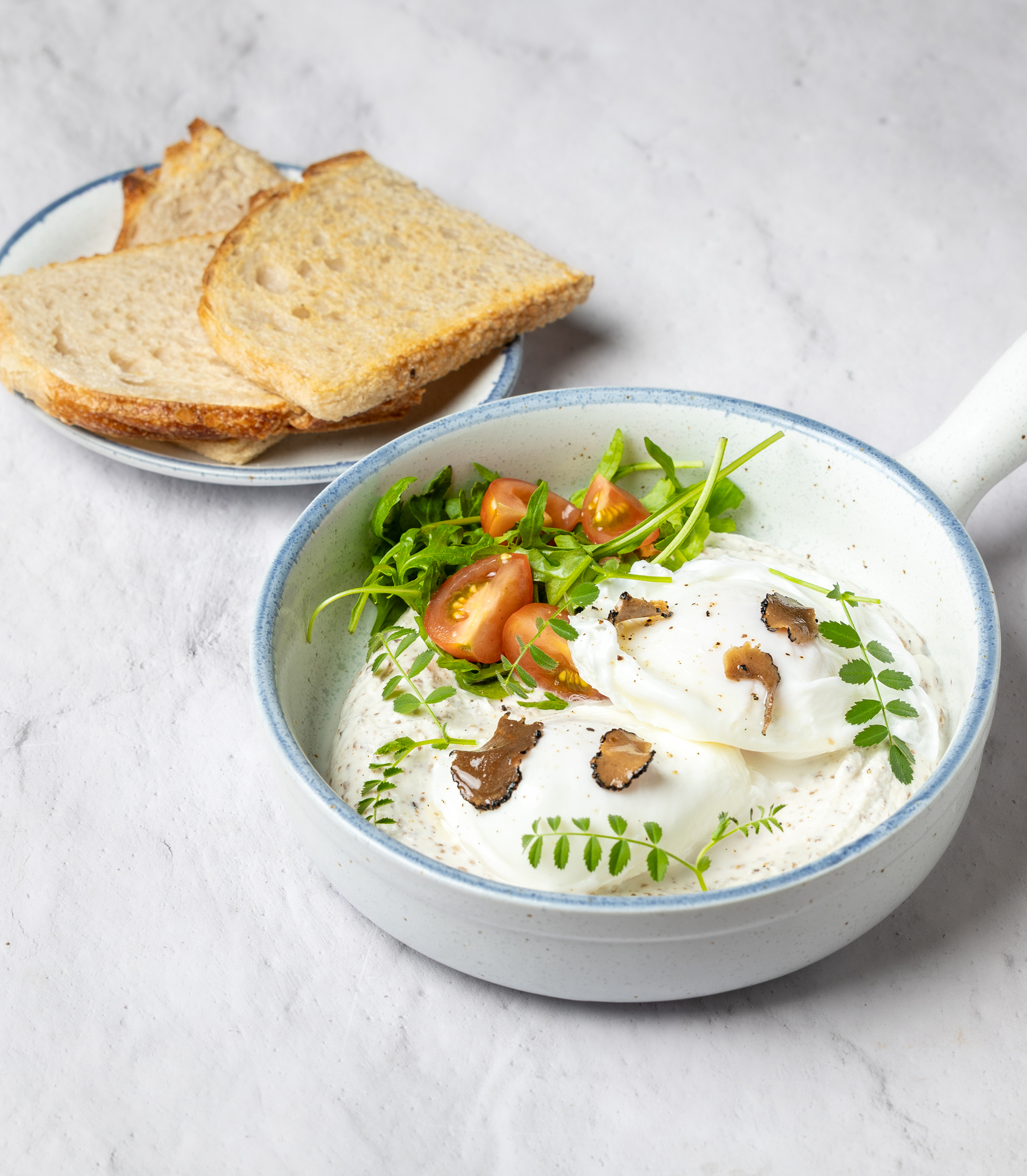 Sourdough hleb, namaz od tartufa, dva poširana jaja, ramstek, čeri paradajz - Sourdough bread, truffle spread, two poached eggs, rump steak, cherry